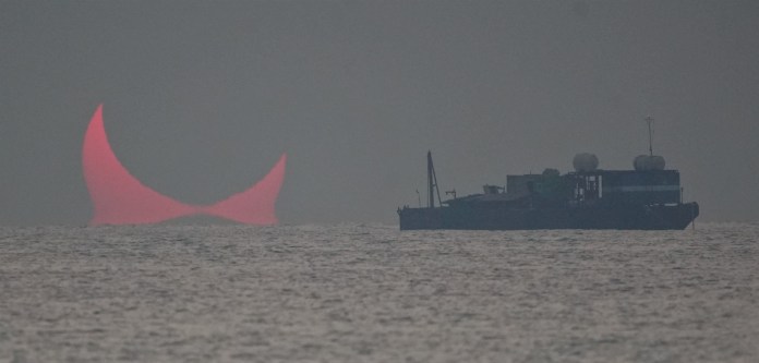 สวัสดีเพื่อนๆ ชาว ไอทีเมามันส์ ทุกคน กลับมาพบกันอีกครั้งกับเรื่องราวที่น่าสนใจจากรอบโลก โดยในครั้งนี้เราจะพาทุกคนมาชมภาพความสวยงามของสุริยุปราคาเขาแดง ที่หาชมยากมาก ถ่ายโดย Elias Chasiotis ภาพที่เห็นนี้ เป็นภาพดวงอาทิตย์กำลังขึ้นจากขอบฟ้าที่กาตาร์ พร้อมกับเกิดสุริยุปราคาทำให้ดวงอาทิตย์แยกตัวออกจากกันเป็น 2 ชิ้น และดูคล้ายๆกับเขาสีแดง โดยภาพนี้ถูกถ่ายไว้เมื่อวันที่ 26 ธ.ค. 2019 ที่ผ่านมา