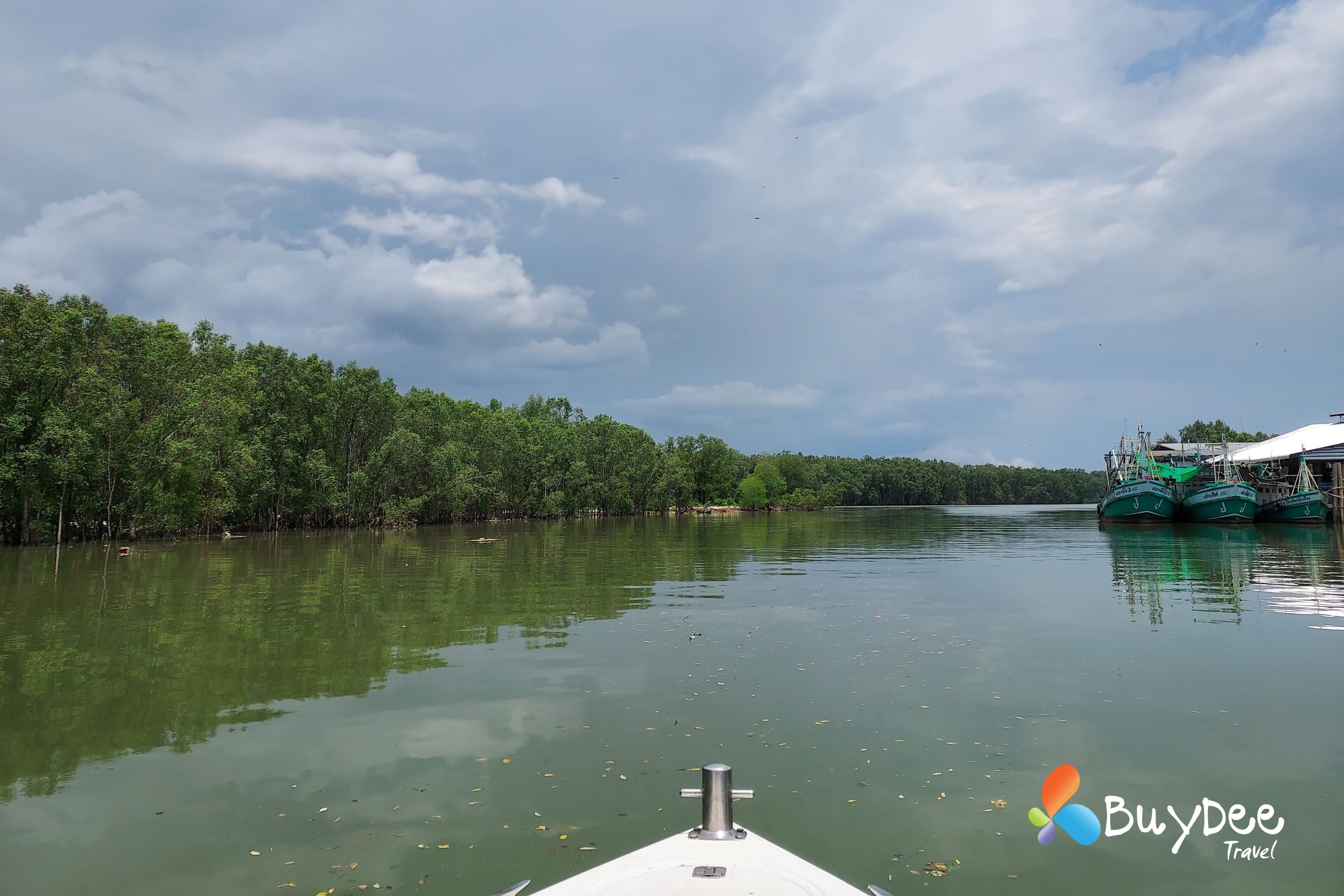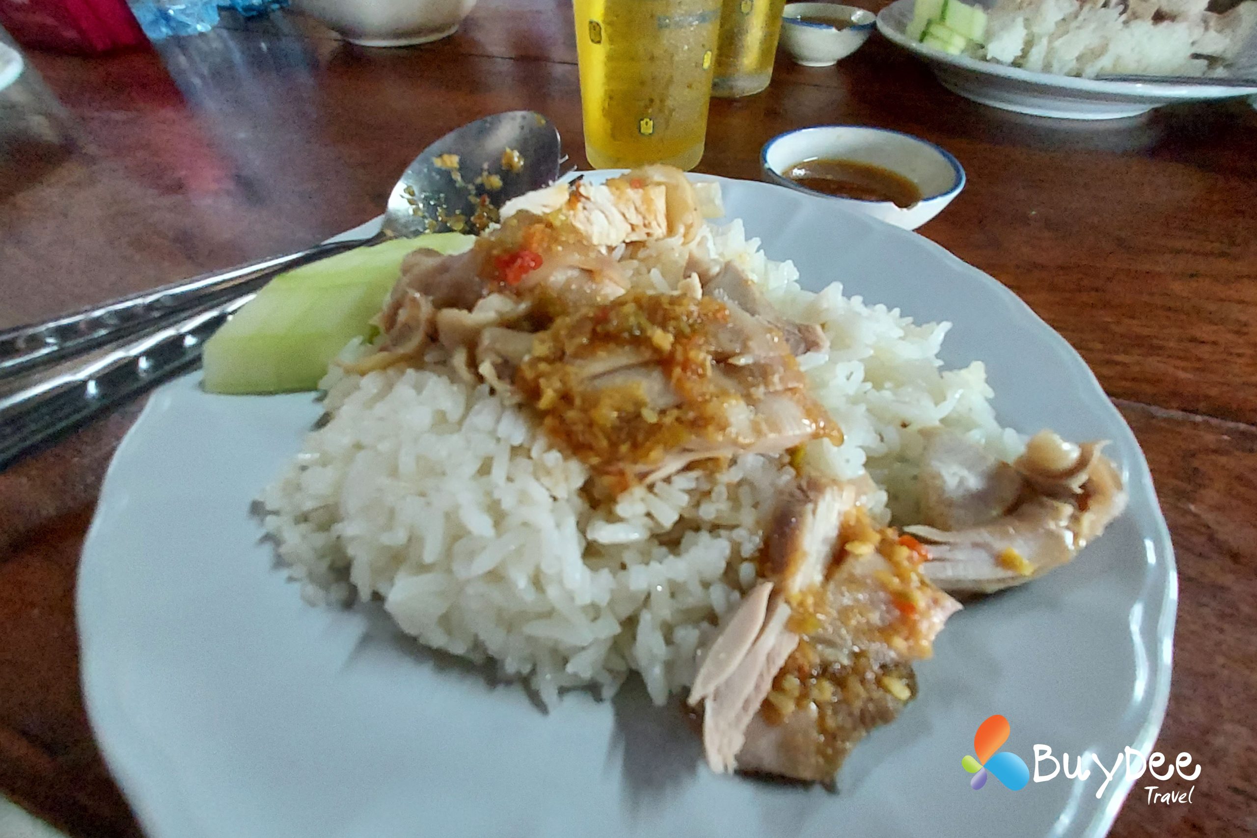 เราตัดสินใจเหมารถตู้ทั้งคัน เพื่อความสะดวกและระหว่างเดินทางจอดทานข้าวที่ร้านข้าวมันไก่ทับหลี หลังจากเติมพลังกันเต็มอิ่มแล้วใช้เวลาไม่นานมากนักเราก็ถึงท่าเรือ นั่งรอเที่ยวเรือตามรอบระยะเวลาอยู่พักใหญ่ มีสายฝนโปรยลงมาเล็กน้อย และก็กระโดดขึ้นเรือสปีดโบทมุ่งหน้าไปยังเกาะพยาม
