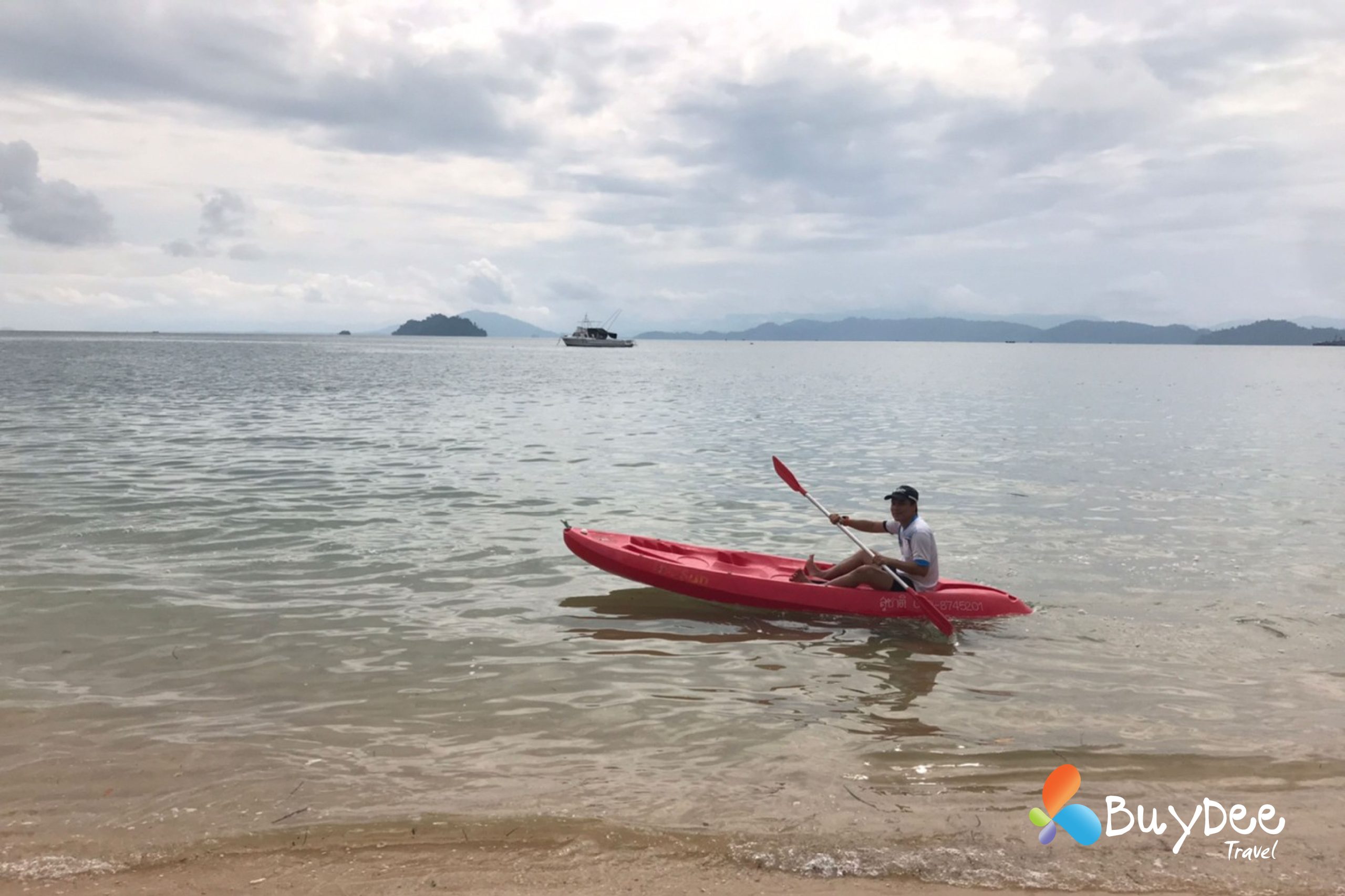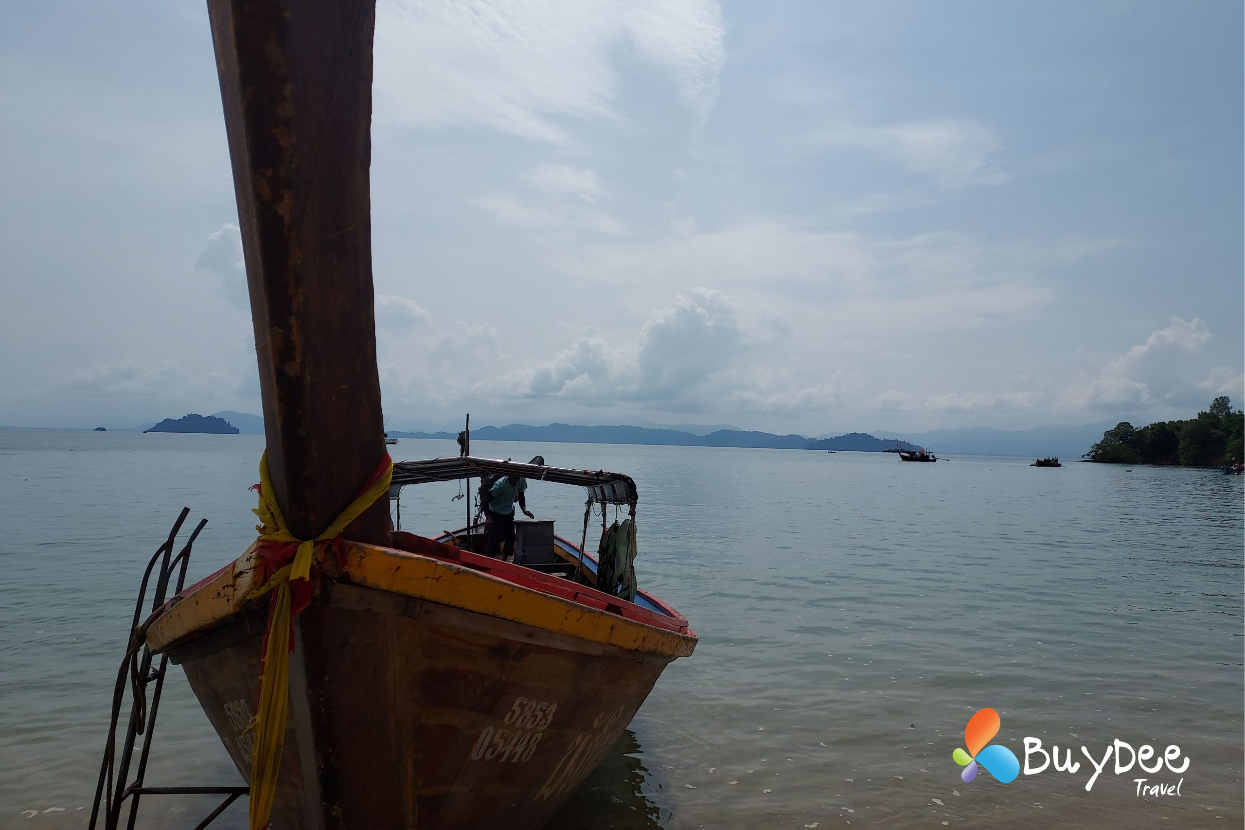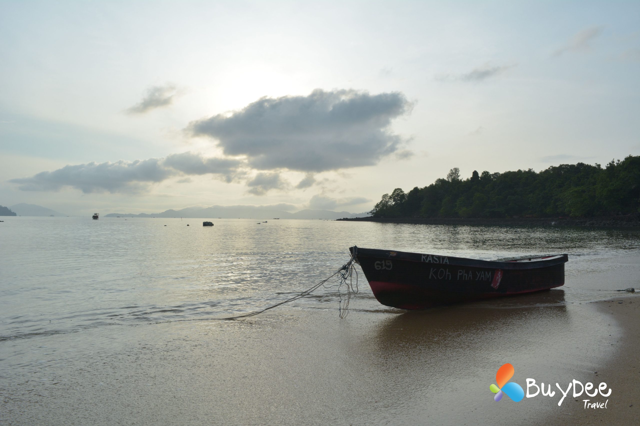 เราตัดสินใจเหมารถตู้ทั้งคัน เพื่อความสะดวกและระหว่างเดินทางจอดทานข้าวที่ร้านข้าวมันไก่ทับหลี หลังจากเติมพลังกันเต็มอิ่มแล้วใช้เวลาไม่นานมากนักเราก็ถึงท่าเรือ นั่งรอเที่ยวเรือตามรอบระยะเวลาอยู่พักใหญ่ มีสายฝนโปรยลงมาเล็กน้อย และก็กระโดดขึ้นเรือสปีดโบทมุ่งหน้าไปยังเกาะพยาม